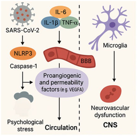 Figure 2 illustrates the interplay between inflammatory and vascular processes triggered by SARS-CoV-2 infection. Activation of the NLRP3 (NOD-like receptor family pyrin domain containing 3) inflammasome and caspase-1 promotes the release of proinflammatory cytokines, including interleukin-6 (IL-6), interleukin-1 beta (IL-1β), and tumor necrosis factor alpha (TNF-α). These cytokines upregulate vascular permeability and proangiogenic factors such as vascular endothelial growth factor A (VEGF-A), which disrupt the blood–brain barrier (BBB) and alter vascular homeostasis. This cascade facilitates microglial activation and contributes to neurovascular dysfunction, ultimately compromising central nervous system (CNS) integrity in Long COVID [35,54,55,57,58,59].