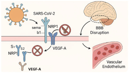 This figure illustrates the disruption of neuropilin-1 (NRP1)-mediated signaling by SARS-CoV-2. Under physiological conditions, NRP1 functions as a co-receptor for vascular endothelial growth factor A (VEGF-A, labeled “A”) and semaphorin b1 (Sema b1), coordinating the signaling pathways involved in vascular homeostasis, blood–brain barrier (BBB) stability, and neuronal guidance [55,75]. These ligands bind to the b1 domain of NRP1 to maintain endothelial integrity and regulate neurovascular function. Following SARS-CoV-2 infection, the S1 subunit of the viral spike protein competitively binds to the same b1 domain of NRP1, blocking access to endogenous ligands. This interference disrupts intracellular signaling, compromises BBB function, promotes endothelial dysfunction, and contributes to the neurovascular injury and impaired CNS homeostasis observed in Long COVID [55,75,76].