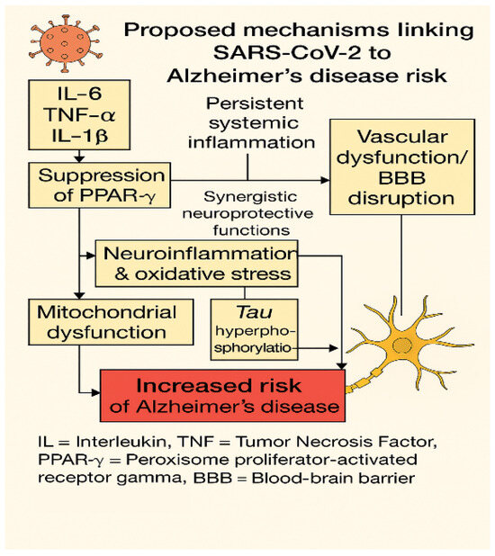 This diagram illustrates the main molecular pathways linking SARS-CoV-2 infection to Alzheimer’s-like neurodegeneration, as observed in Long COVID. Persistent systemic inflammation, characterized by elevated circulating levels of interleukin-6 (IL-6), tumor necrosis factor alpha (TNF-α), and interleukin-1 beta (IL-1β), leads to suppression of two key neuroprotective transcription factors: peroxisome proliferator-activated receptor gamma (PPAR-γ) and nuclear factor erythroid 2–related factor 2 (NRF2) [31,51,151]. These factors function synergistically to preserve mitochondrial integrity, redox balance, and vascular homeostasis [152,153]. Their downregulation promotes oxidative stress and mitochondrial dysfunction, which, together with activation of kinases such as GSK-3β and CDK5, contributes to tau hyperphosphorylation—an early neuropathological feature of Alzheimer’s disease [82,154].