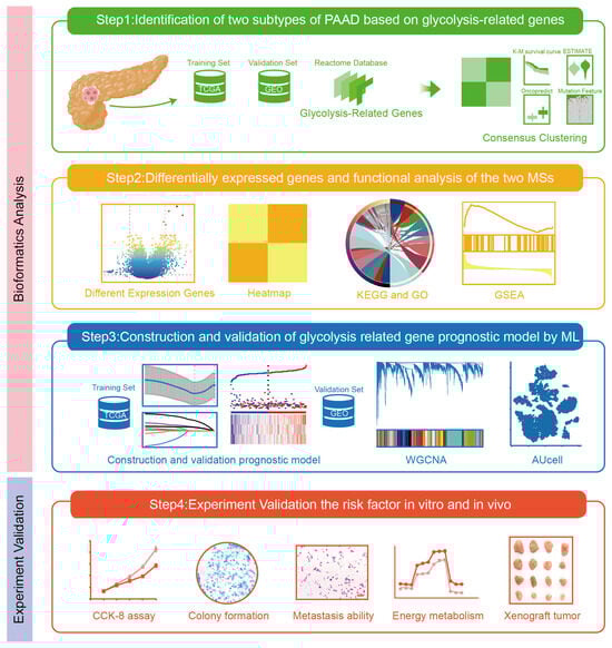Given the important role of glycolytic reprogramming in PAAD progression and lack of glycolysis-specific molecular subtype, this study aimed to identify molecular subtypes of PAAD by clustering glycolysis-related genes. Unlike previous analyses of individual glycolysis genes, the novelty of this study is identifying unique glycolysis molecular clusters that exhibit distinct immune infiltration and survival outcomes. Meanwhile, our research develops a prognosis risk model depending on glycolysis-related genes. The prognosis risk model is superior to the traditional models that rely on single-gene markers. This study deepens the understanding of how glycolytic dysregulation orchestrates tumor progression and provides a translational foundation for glycolysis-targeted therapy. Overall, this study fills the gap of glycolysis-related genes as prognostic targets for PAAD treatment, positioning glycolysis not only as a metabolic marker but also as a feasible target for subtype and prognosis. Figure 1 demonstrates the main content of this research.
