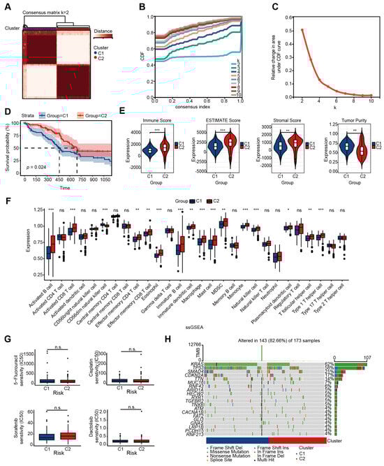 Consensus cluster and immune analysis in the two clustered subgroups. (A–C) Through consensus clustering, we found that two clusters (k = 2) provided the best solution. (D) Kaplan–Meier of the two clusters. (E) Immune score, ESTIMATE score, stromal score, and tumor purity calculated by ESTIMATE. (F) ssGSEA evaluated the expression of microenvironment cells. (G) Drug resistance scores were estimated by the “oncopredict” R package using GDSC data as the training cohort. (H) The somatic mutation features of the two clusters. (* p < 0.05; ** p < 0.01; *** p < 0.001, n.s. = no significance; independent Student’s t-test.).