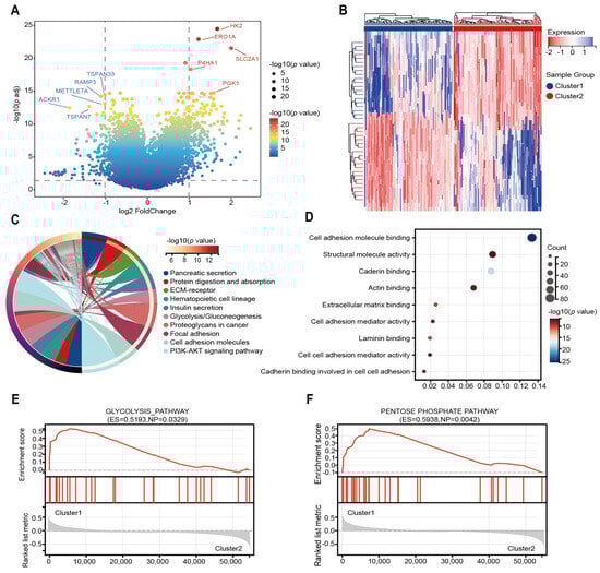 To investigate fundamental distinctions in biological functions and signaling pathways between these two molecular subtypes, we performed transcriptome differentially expressed genes analysis. Among the 298 DEGs identified, 176 genes showed increased expression while 122 exhibited decreased expression in Cluster 1 (Figure 3A,B). KEGG enrichment analysis on DEGs identified many functional pathways related to the pancreas, including pancreatic secretion, protein digestion and absorption, and glycolysis/gluconeogenesis, indicating heterogeneity in pancreatic function between the two molecular subtypes (Figure 3C). Additionally, key biological processes related to tumorigenesis and metastasis, including the PI3K-AKT signaling pathway, showed significant enrichment. The molecular function of GO enrichment analysis is also enriched in the related functions of tumorigenesis and metastasis (Figure 3D). We also analyzed the biological processes and cellular components of GO analysis as presented in Supplementary Figure S2B,C. GSEA revealed that multiple glucose metabolism-related pathways, including glycolysis and the pentose phosphate pathway, were significantly enriched in Cluster 1 (Figure 3E,F).