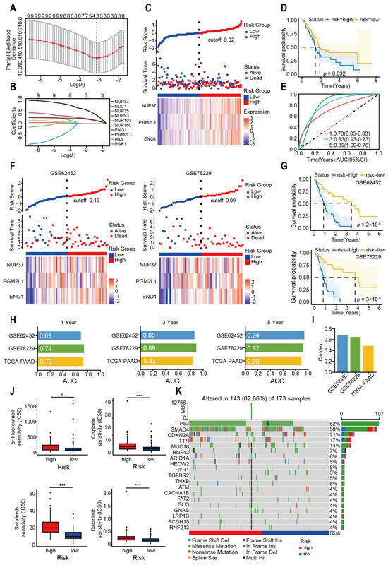 Development of a Machine Learning-Based Prognostic Risk Model. (A,B) LASSO regression analysis with optimal λ selection. (C) Visualization of survival time, risk score, and gene expression heatmap for PAAD patients. (D) Kaplan–Meier survival curves comparing the two risk subgroups. (E) Results about the ROC curve of the prognostic model are demonstrated. (F) Visualization of survival time, risk score, and gene expression heatmap in the two verification cohorts. (G) Kaplan–Meier survival curves in the two verification cohorts. (H) The AUC values of ROC curve for the training and test cohorts. (I) The C-index of train cohort and test cohorts. (J) Drug resistance scores were estimated by the “oncopredict” R package using GDSC data as the training cohort. (K) The somatic mutation features of the two risk groups. (* p < 0.05; *** p < 0.001, Wilcoxon rank-sum test.).