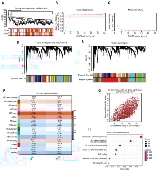 To measure gene correlation within the model group, we use “WGCNA v1.72-5” to construct gene co-expression networks (Figure 5A–C). By calculating the correlation matrix between Module Eigengenes, modules whose similarity is higher than a set threshold are merged (Figure 5D,E). The highest correlation was demonstrated by the “brown” module (R = 0.83) (Figure 5F,G). The prognostic model group was similar to the gene module of patient prognosis. KEGG enrichment analysis of the brown module revealed key pathways, including glycolysis and JAK-STAT signaling (Figure 5H). These results highlighted the significance of the model’s predictive accuracy for clinical outcomes and identifying high-risk patients through dysregulated glycolysis pathways.