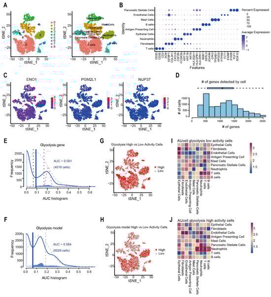To evaluate the glycolysis prognostic model at single-cell resolution, we analyzed a corresponding dataset, GSE212966, with 6 pancreatic cancer specimens. Dimensionality reduction via PCA followed by t-SNE clustering resolved nine distinct cell populations. Through differential expression analysis across all cell clusters, they were marked as Epithelial cells, Fibroblasts, Mast cells, Endothelial cells, Antigen-Presenting Cells, Neutrophils, Pancreatic Stellate Cells, B cells, and T cells (Figure 6A). Visualize the characteristic genes of each type of cell (Figure 6B). Through single-cell localization visualization of the glycolytic prognostic model factors, the risk factor ENO1 exhibited the strongest expression (Figure 6C). We utilized AUCell to evaluate the activity of the gene set of the glycolysis prognosis model in each cell of the single-cell transcriptome (Figure 6D). Using the glycolysis gene set of GSEA as a control, we found that both the glycolysis prognosis model and the glycolysis gene set had relatively high AUCell values (Figure 6E,F). We also found that the cell subtypes with a high AUCell score of the glycolysis prognosis model were mainly concentrated in Neutrophils (Figure 6G,H). CellphoneDB analysis demonstrated Neutrophils among the AUCell glycolysis high-activity cells exhibited stronger cell communication with B cells, T cells, and other cell types (Figure 6I,J).