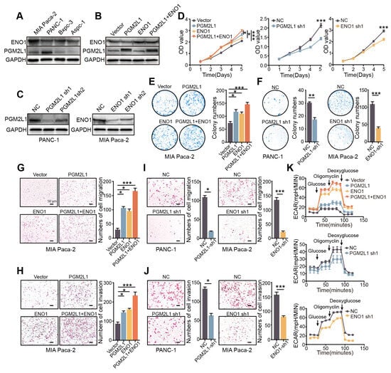 According to endogenous expression, we selected the PAAD cell line. MIA Paca-2 was used to establish a stable overexpression cell model, overexpressing PGM2L1, ENO1, or both co-expression (Figure 7A,B). PGM2L1 and ENO1 were silenced by short hairpin RNA (shRNA) in Panc-1 and MIA Paca-2, respectively (Figure 7C). Cell proliferation and colony formation assays showed that cells overexpressing PGM2L1 or ENO1 significantly enhanced the proliferation ability, while cells co-expressing PGM2L1 and ENO1 exhibited the strongest proliferative ability, and knockdown of PGM2L1 and ENO1 reduced cell growth and colony formation (Figure 7D–F). Migration and invasion assays demonstrated that exogenous overexpression of PGM2L1 or ENO1 significantly enhanced cell motility (Figure 7G) and invasion potential (Figure 7H). Consistent with cell growth assays, cells co-expressing PGM2L1 and ENO1 showed the strongest motility and invasion potential. Knockdown of PGM2L1 and ENO1 significantly impaired the migratory and invasive capacities of cells (Figure 7I,J).