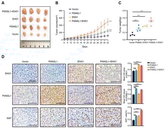 We further explored the impact of PGM2L1 and ENO1 in vivo. Subcutaneous injection was used to generate mouse xenograft tumor models of MIA Paca-2 cells overexpressing PGM2L1, ENO1, co-expressing, and the control into the right dorsolateral regions of these nude mice (n = 4 per group). Tumor volume was monitored by caliper. After 32 days of tumor growth, the tumor tissues were dissected and weighed. The results showed that PGM2L1 and ENO1 promote the growth of xenograft tumors, and the tumors in the co-expression group were larger than other groups (p < 0.05; Figure 8A–C). IHC staining showed that the Ki67 level was increased in PGM2L1 and ENO1 co-expressing cells (Figure 8D). These findings show PGM2L1 and ENO1 accelerate tumor growth in xenograft models, supporting their oncogenic roles.