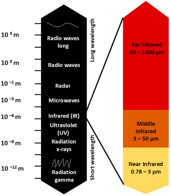 Infrared light is a type of electromagnetic radiation with wavelengths ranging from 0.78 to 1000 μm, further divided into three parts: near-infrared (0.78–3.0 μm), mid-infrared (3.0–50 μm), and far-infrared (50–1000 μm) (Figure 1) [22].