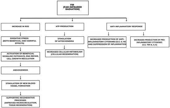 The figure illustrates the molecular and cellular mechanisms induced by FIR. FIR exposure leads to an increase in reactive oxygen species (ROS), triggering oxidative stress that can have both beneficial and detrimental effects. This stress activates key molecular signaling pathways involved in DNA repair, cell growth regulation, and mitochondrial function. The stimulation of mitochondria enhances ATP production and cellular metabolism, promoting regeneration and increased cellular activity. Additionally, FIR influences angiogenesis by inducing signaling cascades that support new blood vessel formation and tissue repair. Another crucial effect of FIR is its immunomodulatory role, characterized by an increased production of anti-inflammatory cytokines, such as interleukin-10 (IL-10), and a reduction in pro-inflammatory cytokines, including TNF-α and IL-6.