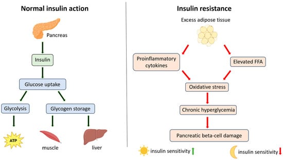 Mechanism of normal insulin action and insulin resistance. The diagram illustrates the differences between normal insulin signaling and the development of insulin resistance, highlighting the roles of pro-inflammatory cytokines, free fatty acids (FFAs), and oxidative stress.
