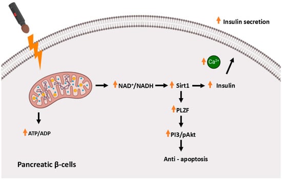 As reported by Hsu et al. [78], far-infrared light therapy significantly reduced fasting blood glucose levels in mice with NA-STZ-induced diabetes, a model that partially mimics type 2 diabetes by inducing beta-cell dysfunction rather than complete destruction. This suggests the potential application of this therapy in the treatment of metabolic disease. To analyze the effect of infrared radiation, the researchers irradiated the mice daily for 30 min over 1 and 2 weeks, using a wavelength range of 8–10 μm. As reported in the results, after two weeks of irradiation, both a decrease in glucose level and an increase in insulin levels were observed in the experimental group of mice and the positive control. Histological IHC analyses showed increased survival of pancreatic beta cells in the experimental groups, along with enhanced insulin production. Furthermore, the effect of FIR on the induction of the PLZF protein (promyelocytic leukemia zinc finger, ZBTB16) was demonstrated in the treated group compared to the control group. Studies suggest that PLZF may play a role in the protection of the vascular endothelium and also influence metabolism and oxidative stress [79,80,81]. It contributes to the regulation of metabolic pathways, including Sirtuin 1 (Sirt1), a NAD+-dependent deacetylase that plays a critical role in cellular metabolism, particularly in pancreatic beta cells. The activation of Sirt1 through FIR radiation increases the NAD+/NADH ratio, a key signal for enhancing mitochondrial function. The elevated NAD+/NADH ratio activates Sirt1, promoting the deacetylation of several substrates involved in mitochondrial biogenesis, oxidative stress response, and energy metabolism. These effects lead to enhanced mitochondrial ATP production, which is crucial for insulin secretion. Additionally, Sirt1 exerts anti-apoptotic effects in β-cells by inhibiting the expression of pro-apoptotic proteins and repressing uncoupling protein 2 (UCP2), a negative regulator of insulin secretion. By decreasing UCP2, Sirt1 enhances ATP generation, further supporting insulin release. Moreover, Sirt1 interacts with PLZF, enhancing its expression and promoting its anti-apoptotic effects. PLZF, in turn, plays a vital role in maintaining β-cell mass by protecting cells from oxidative stress and apoptosis, both of which are crucial mechanisms in the context of diabetes. The interaction between Sirt1 and PLZF creates a synergistic pathway that not only protects β-cells but also promotes their function and insulin production. In the next phase of the experiment, after 60 min of FIR irradiation, the researchers demonstrated an increase in mitochondrial function in RIN-m5f cells, along with an increase in the NAD+/NADH ratio in these cells. Therefore, the action of FIR light protected pancreatic beta cells from apoptosis while simultaneously stimulating insulin production and secretion (Figure 4).