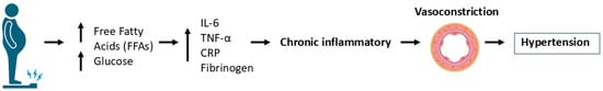 Pathophysiological mechanism linking obesity, inflammation, and hypertension. The diagram illustrates the pathway through which obesity contributes to the development of hypertension. Increased levels of free fatty acids (FFAs) and glucose lead to the upregulation of pro-inflammatory cytokines, including interleukin-6 (IL-6), tumor necrosis factor-alpha (TNF-α), C-reactive protein (CRP), and fibrinogen. The resulting chronic inflammatory state induces vascular dysfunction and vasoconstriction, ultimately leading to hypertension.