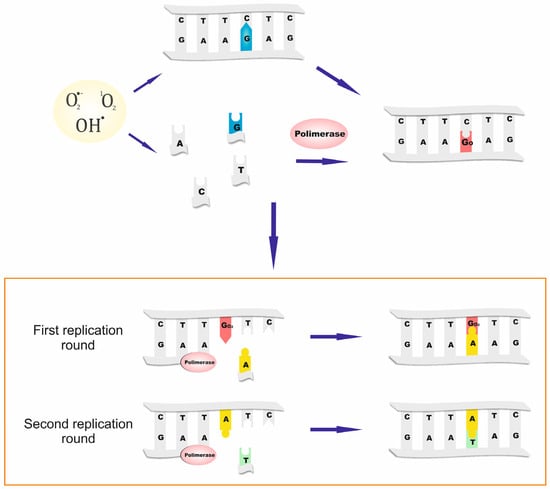 ROS can damage both nucleotides in free nucleotide pool, and nucleobases that are already part of a DNA strand. The nucleotide most prone to oxidation is 2′-deoxyguanosine-5′-triphosphate (dGTP). The oxidized form—8-oxo-dGTP—can be mistakenly incorporated into DNA by polymerase and mispair with adenine, causing permanent mutation after the second replication round.