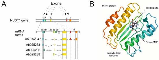 (A)—Structure of the NUDT1 gene, consisting of five exons, along with alternatively spliced mRNA variants encoding the most common protein isoform, p18. The numbers of individual splice variants were obtained from the NCBI GenBank database. (B)—Three-dimensional structure of the MTH1 protein, highlighting the catalytic site, substrate-binding site, and the molecule representing the primary product of the enzymatic reaction catalyzed by the 8-oxo-dGTPase enzyme.