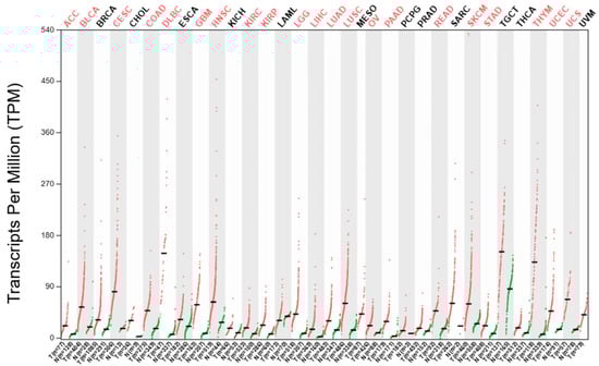 NUDT1 transcript levels were analyzed across 9663 samples of cancer tissues and 5540 samples of normal tissues. Data from the TCGA database were used to generate the chart, and the ANOVA test was selected as the statistical method for result analysis. Red color—cancer tissues; green color—normal tissues. Cancer types in which overexpression was statistically significant compared to reference tissues are marked in red. Abbreviations: ACC—Adenoid Cystic Carcinoma, BLCA—Bladder Urothelial Carcinoma, BRCA—Breast Cancer, CESC—Cervical squamous cell carcinoma and endocervical adenocarcinoma, CHOL—Cholangiocarcinoma, COAD—Colon adenocarcinoma, DLBC—Lymphoid Neoplasm Diffuse Large B-cell Lymphoma, ESCA—Esophageal carcinoma, GBM—Glioblastoma multiforme, HNSC—Head and Neck squamous cell carcinoma, KICH—Kidney Chromophobe, KIRC—Kidney renal clear cell carcinoma, KIRP—Kidney renal papillary cell carcinoma, LAML—Acute Myeloid Leukemia, LIHC—Liver Hepatocellular Carcinoma, LUAD—Lung Adenocarcinoma, LUSC—Lung Squamous Cell Carcinoma, MESO—Mesothelioma, PAAD—Pancreatic Adenocarcinoma, PCPG—Pheochromocytoma and Paraganglioma, OV—Ovarian serous cystadenocarcinoma, PRAD—Prostate Adenocarcinoma, READ—Rectum Adenocarcinoma, SARC—Sarcoma, SKCM—Skin Cutaneous Melanoma, STAD—Stomach Adenocarcinoma, TGCT—Testicular Germ Cell Tumors, THYM—Thymoma, UCEC—Uterine Corpus Endometrial Carcinoma, THCA—Thyroid Carcinoma, UCS—Uterine Carcinosarcoma, UVM—Uveal Melanoma.