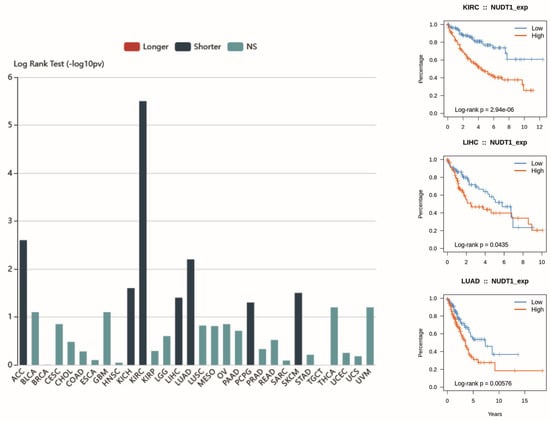 Association between NUDT1 expression and Overall Survival across cancer types. Data from the TISIDB database, Log rank test: p < 0.05. Abbreviations: ACC—Adrenocortical carcinoma, BLCA—Bladder Urothelial Carcinoma, BRCA—Breast invasive carcinoma, CESC—Cervical squamous cell carcinoma and endocervical adenocarcinoma, CHOL—Cholangiocarcinoma, COAD—Colon adenocarcinoma, ESCA—Esophageal carcinoma, GBM—Glioblastoma multiforme, HNSC—Head and Neck squamous cell carcinoma, KICH—Kidney Chromophobe, KIRC—Kidney renal clear cell carcinoma, KIRP—Kidney renal papillary cell carcinoma, LGG—Brain Lower Grade Glioma, LIHC—Liver hepatocellular carcinoma, LUAD—Lung adenocarcinoma, LUSC—Lung squamous cell carcinoma, MESO—Mesothelioma, OV—Ovarian serous cystadenocarcinoma, PAAD—Pancreatic adenocarcinoma, PCPG—Pheochromocytoma and Paraganglioma, PRAD—Prostate adenocarcinoma, READ—Rectum adenocarcinoma, SARC—Sarcoma, SKCM—Skin Cutaneous Melanoma, STAD—Stomach adenocarcinoma, TGCT—Testicular Germ Cell Tumors, THCA—Thyroid carcinoma, UCEC—Uterine Corpus Endometrial Carcinoma, UCS—Uterine Carcinosarcoma, UVM—Uveal Melanoma.