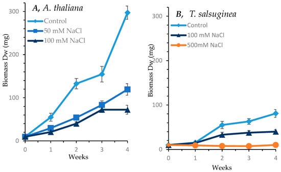 Effect of salt stress on shoot growth over a period of 4 weeks in A. thaliana (A) and T. salsuginea (B), expressed as dry weight (DW). Each point is a mean of three replicates, and error bars are standard errors calculated from the three replicates (p ≤ 0.002 at 10 days of salt stress at 100 mM).