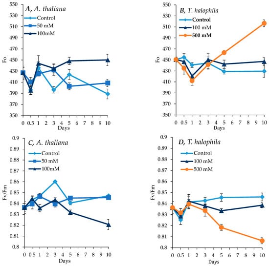 Maximum chlorophyll fluorescence (Fo) and PSII activity (Fv/Fm) in A. thaliana (A,C) and T. salsuginea (B,D) plants subjected to salt stress. Each point is a mean of three replicates, and error bars are standard errors calculated from the three replicates (p ≤ 0.012, at 10 days of salt stress at 100 mM).