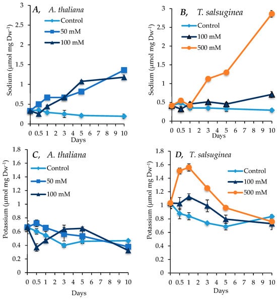Levels of Na+ and K+ measured in shoots of A. thaliana (A,C) and T. salsuginea (B,D) over a 10-day period of salt treatment (NaCl). Each point is a mean of three replicates, and error bars are standard errors calculated from the three replicates (p ≤ 0.02, at 10 days of salt stress at 100 mM).