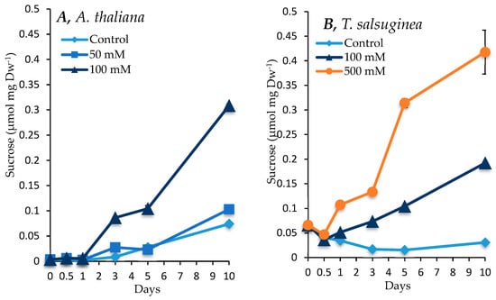 Levels of sucrose measured in shoots of A. thaliana (A) and T. salsuginea (B) over a 10-day period of salt treatment (NaCl). Each point is a mean of three replicates, and error bars are standard errors calculated from the three replicates (p < 0.001, at 10 days of salt stress at 100 mM).