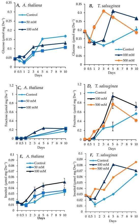 Levels of fructose, glucose, and inositol measured in shoots of A. thaliana (A,C,E) and T. salsuginea (B,D,F) over a 10-day period of salt treatment (NaCl). Each point is a mean of three replicates, and error bars are standard errors calculated from the three replicates (p < 0.002, at 10 days of salt stress at 100 mM).
