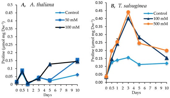 Level of proline measured in shoots of A. thaliana (A) and T. salsuginea (B) over the 10-day period of salt treatment (NaCl). Each point is a mean of three replicates, and error bars are standard errors calculated from the three replicates (p < 0.005 at 3 and 5 days of salt stress at 100 mM).