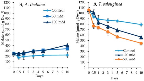 Change in malic acid levels in shoots of A. thaliana (A) and T. salsuginea (B) induced by salt treatment (NaCl) over 10 days. Each point is a mean of three replicates, and error bars are standard errors calculated from the three replicates (p < 0.005 at 10 days of salt stress at 100 mM).
