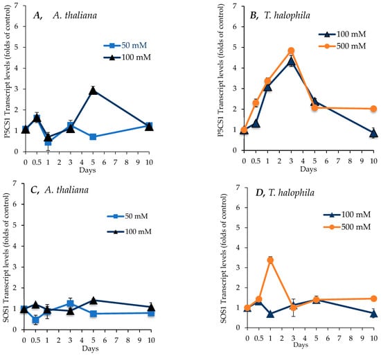 Figure 8C,D show changes in SOS1 transcript levels in the shoots and roots of A. thaliana and T. salsuginea under the effect of salt treatment over a period of 10 days. There was no significant change in relative transcript levels for the SOS1 gene in the shoots of either plant species under salt treatment at 50 and 100 mM [NaCl]. In T. halophila, salt treatment at 500 mM [NaCl] resulted in a transient, approximately three-fold increase in transcript levels compared to the control at 24 h of salt treatment. SOS1 relative transcript levels declined slightly in the roots during the first 24 h of salt treatment. This decrease was transient, and a steady increase in SOS1 relative transcript levels was induced by salt treatment in both plant species after one day of salt treatment. This increase continued in A. thaliana for up to 10 days of salt treatment and was stronger at 50 mM [NaCl] and reached over twice the T0 value. In T. salsuginea, SOS1 relative transcript levels reached five times those at T0 in the roots of plants treated with 500 mM [NaCl] after 5 days and were over two-fold higher at 100 mM [NaCl]. Over the next 5 days, the relative transcript levels at 500 mM [NaCl] came down, reaching same levels as at 100 mM [NaCl], which were still higher than the levels at T0.
