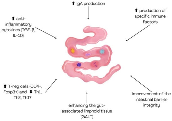 Probiotics offer a wide range of health benefits for both humans and animals, from improving digestion to supporting immune function and mental health. While antibiotics are used sub-therapeutically in animal feed to promote growth, excessive or improper use can lead to the development of antibiotic-resistant bacteria []. This overuse of antibiotics has become a major public health concern due to its potential to cause both human and animal diseases. In addition to the risks posed by antibiotic overuse, foodborne pathogenic bacteria are responsible for major zoonotic diseases such as salmonellosis, campylobacteriosis, and infections caused by pathogenic Escherichia coli in humans []. To address these challenges in livestock and aquaculture production, probiotics have emerged as an effective alternative, promoting animal growth and health without the negative side effects associated with antibiotics. Today, probiotic feed supplements are commonly provided to poultry, ruminants, and fish. These probiotics are mostly Gram-positive bacteria, although Gram-negative bacteria, yeast, and fungi are also used []. Common probiotics include Lactobacillus, Bifidobacterium, Lactococcus, Bacillus, Streptococcus, and yeasts such as Candida and Saccharomyces []. Probiotic strains derived from animals, such as those isolated from the gastrointestinal tract of mammals, are gaining significant attention due to their potential to modulate both local and systemic immune responses. These animal-derived probiotic strains contribute to immune health by influencing the gut-associated lymphoid tissue (GALT), improving intestinal barrier integrity, and enhancing the production of specific immune factors like immunoglobulins and cytokines []. In a recent study [], a novel Limosilactobacillus reuteri (previously known as Lactobacillus reuteri) strain, RGW1, isolated from the feces of healthy calves, was characterized for its probiotic properties, including its immunomodulatory effects. Administration of RGW1 led to a marked increase in the levels of anti-inflammatory cytokines, including TGF-β and IL-10. Studies on BALB/c mice have shown that animal-derived probiotic strains have a significant impact on the immune system. Lactobacillus gasseri SBT2055 (LG2055), administered for 5 weeks, increased IgA production and the number of IgA+ patches in Peyer’s patches and the lamina propria []. Similarly, a mixture of the species L. acidophilus, L. casei, L. reuteri, B. bifidum, and Streptococcus thermophilus, given for 20 days, led to an increase in regulatory T cells (CD4+ Foxp3+) while reducing the population of Th1, Th2, and Th17 cells, suggesting a potential immunomodulatory effect []. The immunomodulatory function of probiotics is illustrated in Figure 2.