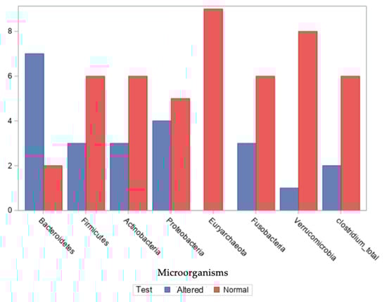 Patients who participated in the study had high levels of bacteria from the phylum Bacteroidetes in their intestinal microbiota; seven of them had altered values above the threshold value deemed normal, which is consistent with the findings of studies by Svensson, Chadchan, and Shan [,,]. The results of Shan [] indicate the existence of the Fusobacteria Phylum. The results of Yuan and Shan [,] suggest that the stool samples of the patients contained Proteobacteria, Actinobacteria, and Firmicutes Phylum.