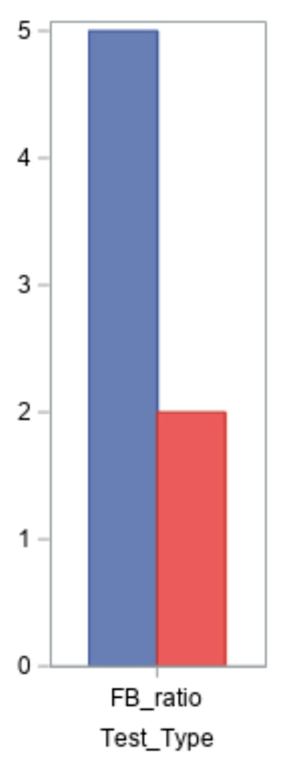 An imbalance in the intestinal microbiota is indicated by an increase or reduction in the Firmicutes/Bacteroidetes ratio (FB ratio), which is cited in the literature as a key indicator of intestinal dysbiosis []. This ratio’s value is less than 1.5 in the normal population. Seven of the nine patients had their ratios evaluated; the findings varied from 0.5 to 35, with two normal values and five altered values (Figure 2).