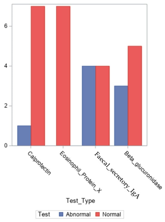 As illustrated in Figure 3, we measured the levels of the inflammatory indicators calprotectin, eosinophil cationic protein X, secretory IgA in faeces and β-glucuronidase. The values for all the inflammatory markers are presented in Supplementary Table S1.
