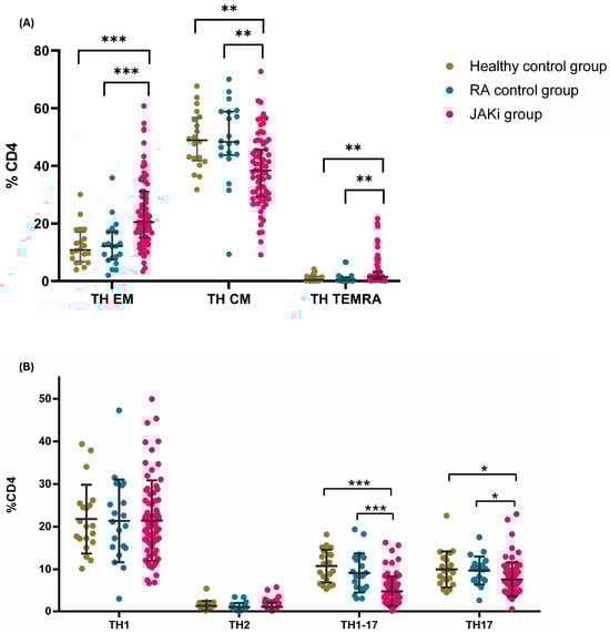 Differentiation status and percentage of T helper subsets in the three groups studied. (A) Dot-plots depicting the percentage of T helper according to their differentiation status, categorised as effector memory T helper (TH EM, CD3+CD4+CD62L−CD45RA−), central memory T helper (TH CM, CD3+CD4+CD62L+CD45RA−), and effector memory re-expressing RA T helper cells (TH TEMRA, CD3+CD4+CD62L−CD45RA+) among healthy (green) patients, the rheumatoid arthritis control group (blue), and the JAKi group (pink). (B) Dot-plots depicting the percentage of T helper subsets, categorised as T helper 1 (TH1, CD3+CD4+CD45RA−CXCR3+CCR6−), T helper 17 (TH17, CD3+CD4+CD45RA−CXCR3−CCR6+), T helper 1-17 (TH1-17, CD3+CD4+CD45RA−CXCR3+CCR6+), and T helper 2 (TH2, CD3+CD4+CD45RA−CXCR3−CCR6−CD294+) among healthy patients (green), the rheumatoid arthritis control group (blue), and the JAKi group (pink).* p < 0.05, ** p < 0.01, and *** p < 0.001.