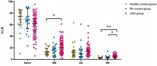 Differentiation status of B cells. Dot-plots depicting the percentage of B cells according to their differentiation status, categorised as naïve (CD19+IgD+CD27−), switched memory B cells (CD19+gD−CD27+), unswitched memory B cells (CD19+IgD+CD27+), and double-negative B cells (CD19+CD27−IgD−) among healthy (green) patients, the rheumatoid arthritis control group (blue), and the JAKi group (pink). * p < 0.05 and ** p < 0.01.