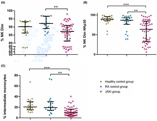 Relevant differences among the innate immune subsets. (A) Dot-plots depicting the percentage of NK Dim cells (CD3−CD56+CD16+) among healthy patients (green), the rheumatoid arthritis control group (blue), and the JAKi group (pink). (B) Dot-plots depicting the percentage of NK Dim cells expressing NKp30 among healthy patients (green), the rheumatoid arthritis control group (blue), and the JAKi group (pink). (C) Dot-plots depicting the percentage of intermediate monocytes (CD14+CD16+) among healthy patients (green), the rheumatoid arthritis control group (blue), and the JAKi group (pink). ** p < 0.01, and *** p < 0.001.