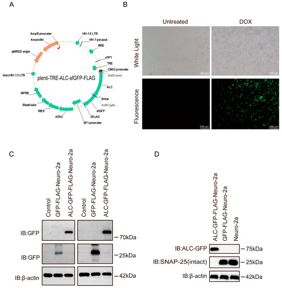 Characterization of the ALC-GFP-FLAG-Neuro-2a stable cell line. (A), plenti-TRE-ALC-sfGFP-FLAG plasmid map. IB, immunoblotting. (B) Fluorescence expression of the cell line observed under a microscope. (C) Detection of protein expression in the stable cell line using GFP and FLAG antibodies. (D) Demonstration of the stable cell line’s ability to cleave the substrate SNAP-25. β-actin served as a loading control to normalize protein input across lanes.