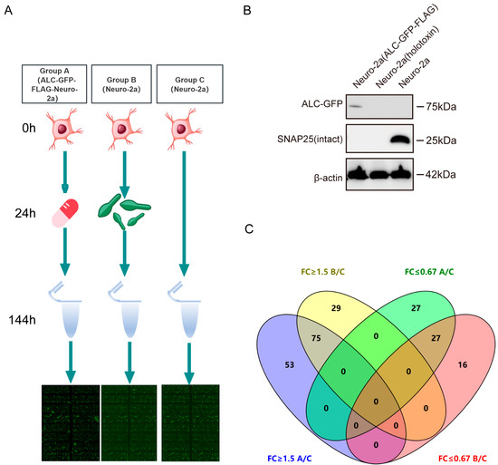Figure 2. Experimental workflow and validation. (A) Flowchart of the phosphorylation antibody array experiment. At the 0 h time point, cells were seeded. At the 24 h time point, group A received doxycycline to induce gene expression, while group B received BoNT/A. At the 48 h time point, DOX was removed from group A. At the 144 h time point, samples were collected for antibody microarray analysis. (B) Validation of the stable cell line expressing the ALC and its ability to cleave the substrate, demonstrating functionality comparable to the full toxin. (C) Venn diagram analysis of proteins with phosphorylation changes (upregulated by ≥50% or downregulated by ≤67%) to identify proteins consistently upregulated or downregulated across both experimental groups. FC: fold change. - Group A consisted of ALC-GFP-FLAG-Neuro-2a cells where ALC was stably expressed as a GFP-FLAG fusion protein under doxycycline-inducible control. Doxycycline (10 µg/mL) was administered at the 24 h time point to induce ALC expression, allowing us to study the effects of ALC in a tightly regulated and inducible manner. This setup provided a controlled system to examine the intracellular effects of ALC expression independent of the toxin delivery complex. Group B utilized wild-type Neuro-2a cells treated with BoNT/A at a concentration of 1 ng/mL. This group simulated the natural process of ALC entering host cells through BoNT/A-mediated delivery, reflecting the physiological route of ALC intracellular activity. Group C served as the control group, utilizing untreated wild-type Neuro-2a cells to establish a baseline for phosphorylation levels in the absence of ALC.
