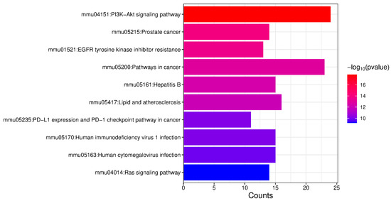 The 75 proteins exhibiting upregulated phosphorylation levels, as identified through Venn diagram analysis, were subjected to Gene Ontology (GO) and KEGG pathway enrichment analysis using the DAVID database (https://davidbioinformatics.nih.gov/ (accessed on 22 March 2024)). The results revealed significant enrichment in the PI3K-AKT signaling pathway, EGFR tyrosine kinase inhibitor resistance, and Ras signaling pathway (Figure 3).