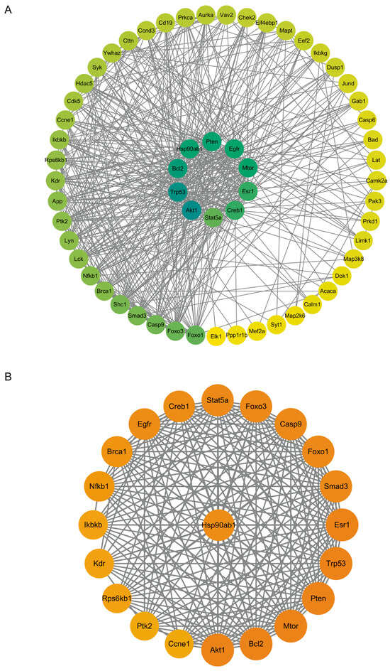 The proteins exhibiting upregulated phosphorylation levels were input into the STRING database (https://cn.string-db.org/ (accessed on 22 March 2024)) to construct a protein–protein interaction (PPI) network, which was subsequently refined and ranked using Cytoscape 3.10.1 (https://cytoscape.org/ (accessed on 22 March 2024)). The MCODE plugin was employed to identify critical subnetworks. The results revealed that the network comprises 59 nodes and 477 edges (Figure 4A), with a clustering coefficient of 0.641. Further analysis using the MCODE plugin identified 1 subnetwork, consisting of 21 nodes and 185 edges, with HSP90AB1 serving as the seed gene (Figure 4B). HSP90 not only assists in the activation of AKT [23] but also stabilizes the light chain of botulinum toxin to enhance its enzymatic activity [24].