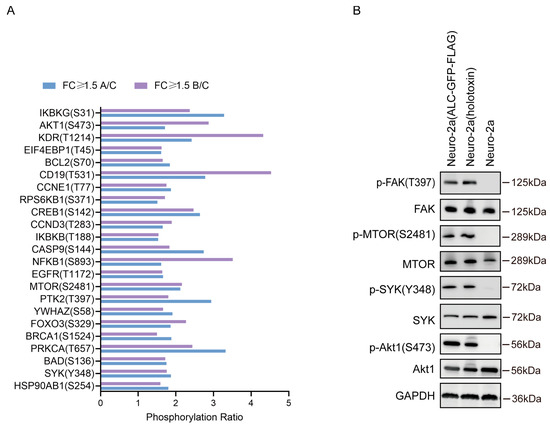 - To investigate the host responses and associated signaling pathways triggered by the intracellular entry of ALC, we conducted a phosphoproteomics analysis using a commercial antibody microarray (Figure 2A). This array is widely applied to identify key signaling proteins that undergo phosphorylation changes in biological processes [17,18,19,20]. The array covers 30 distinct signaling pathways, enabling the detection of 584 phosphorylation sites across 332 key signaling proteins. Our experimental design comprises three groups: Group A, Group B, and Group C.