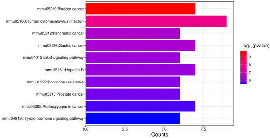 For the 27 proteins exhibiting downregulated phosphorylation levels, pathway enrichment analysis revealed significant associations with bladder cancer, the ErbB signaling pathway, and the thyroid hormone signaling pathway (Figure 6).