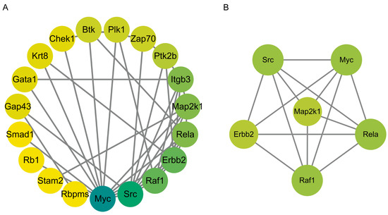 The proteins exhibiting downregulated phosphorylation levels were input into the STRING database to construct a protein–protein interaction (PPI) network (Figure 7A). The network comprises 19 nodes and 39 edges, with a clustering coefficient of 0.391. Further analysis using the MCODE plugin identified 1 subnetwork (Figure 7B), consisting of 21 nodes and 185 edges, with MAP2K1 serving as the seed gene.
