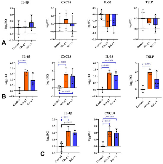 Analysis of relative gene expression levels of IL-33, TSLP, IL-1β and CXCL8 in Aln g 1- or Bet v 1-treated Calu-3 cells in 2 h (A), 6 h (B) and 24 h (C). Log2(Fold changes (FC = 2−ΔΔCq)) are presented as mean ± SD. mRNA levels measured upon treatment were compared to the corresponding non-treated samples, and the graph was prepared using GraphPad Prism v 8.0.1 (GraphPad Software, San Diego, CA, USA). Each biological replicate is demonstrated as different symbols: ●—control, ▲—Aln g 1-treated, ■—Bet v 1-treated. Biological replicates were included in triplicate or quadruplicate (n = 3–4).