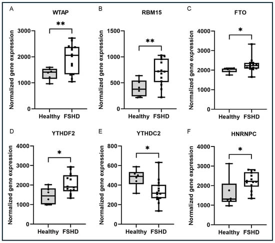 m6A regulators that are differentially expressed in human muscle biopsies: (A) WT1-associated protein (WTAP) gene, (B) RNA binding motif protein 15 (RBM15) gene, (C) FTO alpha-ketoglutarate-dependent dioxygenase (FTO) gene, (D) YTH N6-methyladenosine RNA binding protein F2 (YTHDF2) gene, (E) YTH N6-methyladenosine RNA-binding protein C2 (YTHDC2) gene and (F) heterogeneous nuclear ribonucleoprotein C (HNRNPC) gene. * p < 0.05, ** p < 0.01.