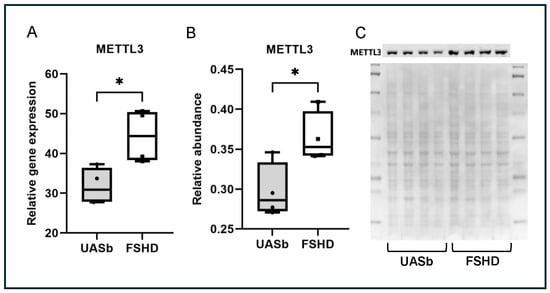 METTL3 gene and protein expression: (A) METTL3 relative gene expression in FSHD myoblasts and their UASbs, (B) METTL3 relative protein abundance in FSHD myoblasts and their UASbs and (C) Western blot of METTL3 protein and total protein of FSHD myoblasts and their UASbs. * p < 0.05.