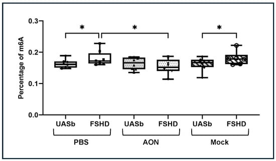 Quantification of the total m6A modification percentages in FSHD myoblasts and their UASbs before and after treatment with AON. UASb: unaffected sibling; PBS: phosphate-buffered saline; AON: 2′-MOE gapmer antisense oligonucleotide targeting DUX4; Mock: scramble antisense oligonucleotide, * p < 0.05.