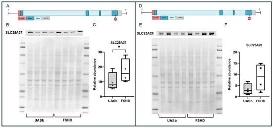Locations of the differential methylated m6A sites and protein quantification of mitoferrins in the FSHD myoblasts and their UASbs: (A) schematical representation of the SLC25A37 gene and annotation of the location of the differential methylated m6A site, (B) Western blot of SLC25A37 (mitoferrin-1) and total protein, (C) relative abundance of SLC25A37 in the FSHD myoblasts and myoblasts of UASbs, (D) schematical representation of the SLC25A28 gene and annotation of the location of the differential methylated m6A site, (E) Western blot of SLC25A28 (mitoferrin-2) and total protein and (F) relative abundance of SLC25A28 in the FSHD myoblasts and myoblasts of UASbs: unaffected sibling. * p < 0.05.