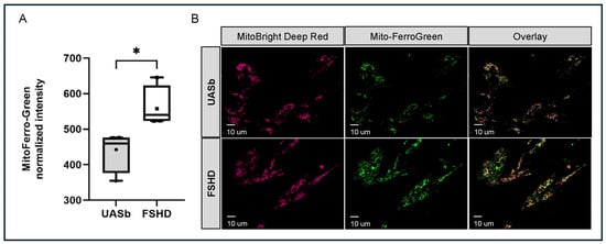 Mitochondrial ferrous (Fe2+) iron quantification in FSHD and UASb myoblasts: (A) Graph depicting the Mito-FerroGreen intensity in FSHD and UASb myoblasts. (B) Representative images of myoblasts stained with MitoBright LT Deep Red, Mito-FerroGreen and overlay of the two channels. UASb: unaffected sibling. * p < 0.05.