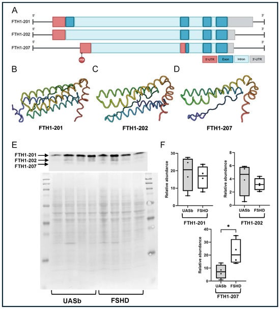 FTH1 gene structure, protein 3D modeling and quantification of FTH1 isoforms: (A) schematical representation of the FTH1 isoforms (201, 202, 207) and annotation of the location of the differential methylated m6A site, (B) 3D protein model of the FTH1-201 isoform, generated by AlphaFold, (C) 3D protein model of the FTH1-202 isoform generated by AlphaFold, (D) 3D protein model of the FTH1-207 isoform generated by AlphaFold, (E) Western blot of the FTH1 isoforms and total protein and (F) relative abundance of the different FTH1 isoforms in the FSHD myoblasts and myoblasts of UASbs. UASb: unaffected sibling. * p < 0.05.