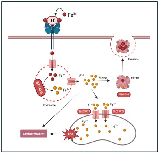 Iron is vital for various physiological functions, including oxygen transport, DNA synthesis and electron transport in mitochondria [72]. Iron regulation in the body is a complex process involving several key proteins that ensure an adequate supply and prevent toxicity. The main proteins involved in iron homeostasis include ferritin, mitoferrin and other regulators such as hepcidin (HAMP), transferrin (TF), its receptor (TFRC) and metalloreductase STEAP3 [73]. Cellular iron homeostasis is carefully balanced to enhance iron supply during deficiency and to limit supply while promoting storage when levels are sufficient [74].